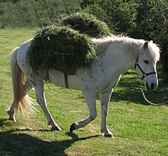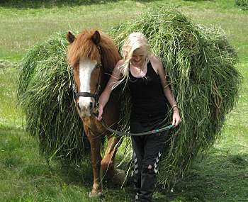 An experimental hay harvest, using traditional tools and methods, was recently conducted by Minjasafn Austurlands. The photo to the left shows Gráni loaded with hay in a klyfberi (pack-saddle). It appeared that Gráni ate more hay than he carried on his back. During the second harvest (right), the pack-saddle on Hringur's back was much more heavily loaded. |