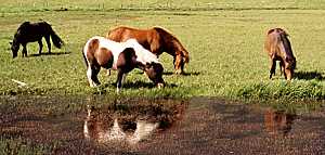 There appears to have been special interest in breeding horses in Iceland, perhaps the only farm animal to be systematically bred. Large breeding stocks were kept, with the goal of producing horses that were especially good for the popular sport of horse fights. Viking age horses closely resembled modern Icelandic horses (right). They're small (15 hands, about 150cm), but sturdy, strong, and willing. |