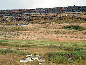In Iceland, grain cultivation must have been difficult even in the best of times. The best chances for success were in the warmer parts of the country, in the south and southwest. Njáls saga, set in the south, contains a number of references to the growing of grain. Chapter 111 tells that Höskuldr Hvítanesagoði went out one morning with his seed bag in one hand and his sword in the other to sow grain in his field (left, as it appears today). The sons of Njál were waiting behind the fence, and they ambushed Höskuldr and killed him. |