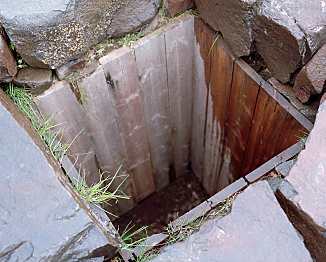 In the earlier part of the Norse period, it appears that everything was contained in the longhouse: animals, people, tools, food storage, work shop. Later, all but the people were moved to out buildings. For example, the early longhouse recently excavated at Aðalstræti 14-16 under the streets of Reykjavík had animal stalls in the living quarters. The floor plan of the house (left) shows the animal stalls located opposite to the front door. While this arrangement was common in early longhouses found in Norway, this is the first example found in Iceland. Farmhouses generally were built on a slope or other high ground, which provided for better drainage. Houses were built near running water. While wells (right) were known and used in the Viking age, especially in densely settled areas like trading towns, running water was preferred at a farmstead. |