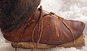 In a paper published after our original experiments, Küchelmann and Zidarov1 describe the lacing method they used successfully with a pair of "medieval style leather shoes". (The full citation and a link to an on-line version of the paper is at the end of this page.) That method worked about as well as my more complicated lacing shown above.