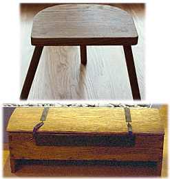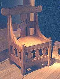 It's unlikely that chairs as elaborate as the reconstruction shown to the left were ever common. The original is from 12th century Norway. The sagas occasionally mention chairs. Chapter 23 of Fóstbræðra saga says that Gríma had a chair carved with a likeness of Þórr and his hammer. Simple three-legged stools, such as the reproduction shown in the top photo to the right, were probably much more common. People also used their wooden storage chests (lower photo, right) as seats. |