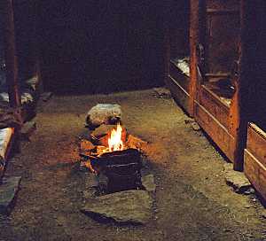 The central corridor of each room, between the row of roof support columns, had a packed dirt floor (right). Ashes from the fires of the house were spread on this area to act as an absorbent. In the Viking-age house at Hofstaðir in north Iceland, slag and hammerscale have been found in this floor layer, suggesting that ashes from the hearth in the smithy were also brought in and spread on the floor in the house. Hofstaðir also had clear evidence of mice living in and around the floor of the longhouse. This central aisle was the passageway between sections of the house. In addition, fires were built in this region, either in a fire pit running lengthwise in the longhouse (left), or in individual fire circles in the rooms. The fire provided light and heat and was also used for cooking. |