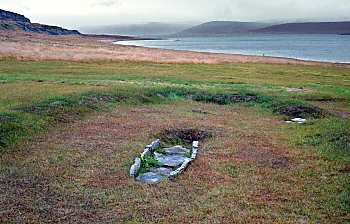 Some houses, such as at Aðalstræti 14-16, had a large and imposing hearth, with stones set on end in the earth, mirroring the shape of the longhouse. The firepit at Vatnsfjörður (left) also follows this form, reflecting the outline of the house. The stone firepit is in the central foreground, and the outline of the walls is made visible in the turf by rise created by the foundation stones still buried just below the surface. In contrast, the firepit at Hofstaðir was surprisingly small, inadequate for the size of the house. The evidence suggests that the house was not usually fully occupied, and that the additional space was used for occasional guests during feasts and celebrations. Some of the stone hearths have compartments built into them, perhaps for keeping food and other items warm, or perhaps for storing tools and other utensils used for the fire or for cooking. |