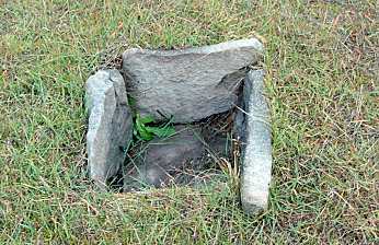 A feature found in the longhouse at Vatnsfjörður is a stone-lined pit in the floor (right, and visible beyond the firepit in the photo above left). The pit contained refuse and may have served as the trash-can for the house. The pit also contained a small piece of gold jewelry, suggesting that the piece was lost on the floor and inadvertently ended up in the trash pit. |