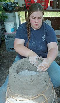 The furnace could be built around a tapered wooden form, or simply by building it up from an earthen base (left), tying off the outside with rope to prevent sagging, and filling the inside with a sand/ash mixture to draw water out of the clay.