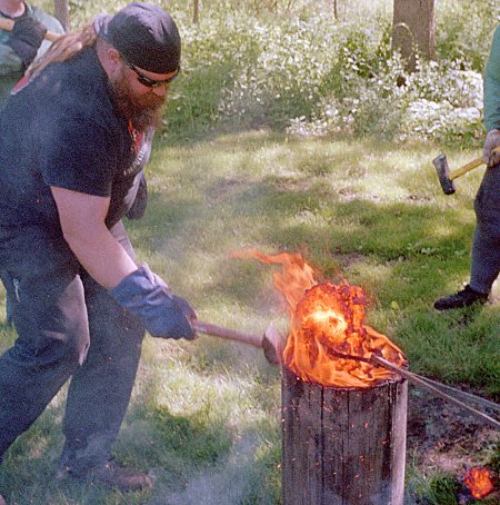 Immediately after removing from the furnace, the remaining material was compacted with sledges to consolidate the material. This work is best done while the bloom retains the heat from the smelting process. A wooden log anvil (left) is often used, since the heat of the bloom burns a depression in the wood, helping to hold the bloom in position as it is worked.