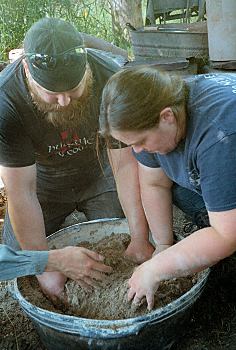 The clay was actually a homogenous mixture of sand, fiber, clay, and water (left). The fiber was introduced into the mix as horse dung, in which the undigested hay provided the fiber. This mix had the needed structural properties to contain the smelting materials, as well as appropriate insulating properties. The walls must radiate enough heat to keep the inside surface from melting into the slag during the smelt.