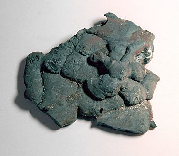 The axe head blanks shown to the right were also trade goods. They were probably exported from Norway and were on their way to a trading center in Denmark when they were lost. They are about 20cm (8inches) long and were found threaded on a wooden stave for convenient handling during shipping.