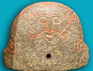 This soapstone artifact was found in Denmark and is interpreted as a bellows shield with a depiction of Loki with his lips sewn shut, the result of his loosing his wager with the dwarf smiths Brokkr and Sindri, told in the myths. The stone is about 20cm (8in) across, with a hole near the base presumably to allow air from the bellows to reach the fire.