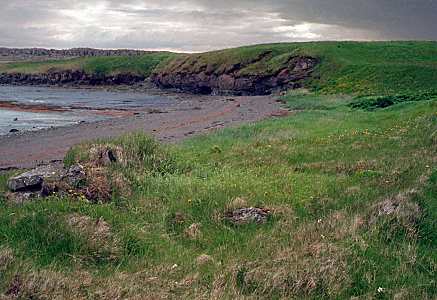 The anvil stone, with its hammer marks, still stands at Rauðanes (left), but it has been moved away from the shore. Ruins (right), which are the probable site of Skallagrím's smithy, are located closer to the shore.