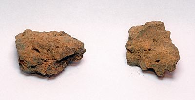 The iron ore shown to the right was excavated from Skógar, a Viking-age iron-making site in Iceland. The larger piece is about 2cm (less than 1in) in the long dimension. Sometime about 1000 years ago, someone gathered this iron ore, processed it, transported it to the iron smelting site, but for unknown reasons, never used it in a smelt.