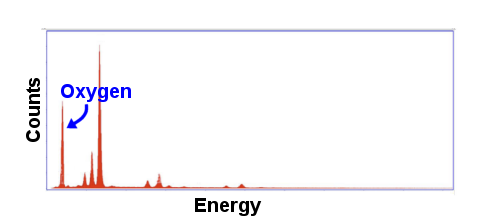 SEM-EDS was used to analyze the iron portions and the slag portions of each sample separately. The process illuminates a small spot of the sample with electrons and measures the spectrum of the X-rays emitted (left). Characteristic energy levels corresponding to various elements can be identified in the spectra, identifying the elements present. The quantity of each energy level identifies the amount of the element present. From this information, the composition of the spot being illuminated can be estimated. The spectrum shown to the left is for the measurement of one of the slag instrusions in H001. The large peak at the left corresponds to oxygen. The height of the peak allows us to calculate the relative amount of oxygen compared to other elements. One limitation of SEM-EDS is that it cannot detect elements lighter than boron. Additionally, light elements are less well estimated. A rule of thumb is that carbon needs to be present at levels above 1% to be reliably detected and measured. |