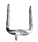 Snaffle bits (left) were the most common type of bit. Stirrups (right) typically had tall hoops with heavy square loops for the leather strap. The spur shown is made of iron with a fine inlay of decorative silver and copper wires, and it has an animal head design on the prick. The grave finds suggest that bridles were very showy with decorative mounts. |