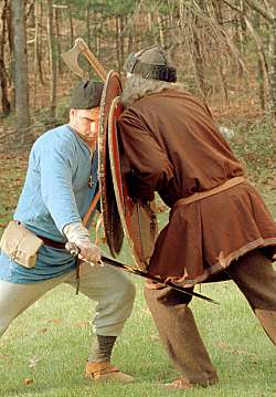 Fights are often mentioned in the sagas. Our research now leads us to believe that the saga authors were experienced fighters, writing for an audience made up of experienced fighters who would be unwilling to accept (and possibly insulted by) exaggeration in the depiction of battle. Additionally, the sagas authors seem to have been aware that weapons had changed between their own time (when the sagas were written) and the Viking age (when the sagas took place). The photo shows a fighter using weapons from the time the sagas were written (left) facing a fighter armed with Viking-age weapons. When the saga authors wrote about weapons and their use, they seem to describe weapons and moves from the Viking age, rather than from their own time. |