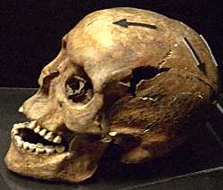 But the bones provide mute testimony that, at least in some cases, these kinds of horrific attacks, and horrific injuries actually took place. The sagas tell of men receiving multiple wounds, any one of which would be lethal, yet continuing to stand and fight. This skull (part of a complete skeleton) tells us that at least in some cases, these events actually happened. The skeleton bears evidence that the man had 2 lethal wounds and several less serious wounds yet was still standing and fighting when a sword penetrated his skull, entered the brain, and killed him. |