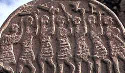 What survives is a small number of stone carvings, wood carvings, bone and horn carvings, and tapestries. Often, they are representations of stories from mythology and from heroic tales. Grave markers (right) and memorial stones (left) sometimes show warriors dressed for battle. |