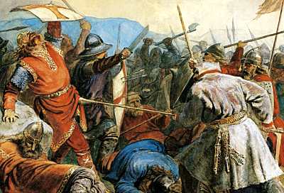 There are examples in the sagas where men thrust weapons up under a mail shirt, causing wounds. After being wounded in the leg during the battle of Stiklastađir in the year 1030, King Ólafr leaned against a boulder. Ţórir hundr thrust his spear up under the king's mail, piercing him through the belly. Kálfr struck a blow to the king's neck. The king fell dead. |