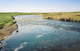 A swimmer under attack from missiles thrown from the shore might cover his back with his shield to protect himself while swimming. In chapter 26 of Bjarnar saga Hítdćlakappa, Björn did just that while swimming across the Hítará to escape an ambush by Ţórđr and his men. The ambush took place on the Hítará in the general area shown in the photo to the right.