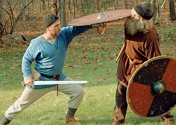 In chapter 32 of Bjarnar saga Hítdćlakappa, Björn drove his shield into his opponent's head to kill him. Using the high shield position described earlier on this page, it's easy to imagine delivering a lethal one-handed punch with the edge of the shield. However, the saga suggests that Björn used two hands. A speculative reconstruction of this move is shown in this combat demo video, part of a longer fight.