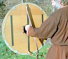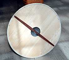 In the Viking age, fighting men used large, round, wooden shields gripped in the center from behind an iron boss. A reproduction shield is shown to the left, and a historical shield from the Oseberg ship to the right.
