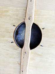 The shield was probably rimmed with leather or rawhide (left) to keep the shield from splitting when hit on edge. The edging helped to bind the shield together, as well, since the leather shrunk after it was installed, forcing the planks more tightly together. The benefits of this kind of edging are shown graphically later on this page.