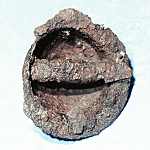 If a hand had been holding the shield when the blow struck, the axe would have partially severed the hand.
