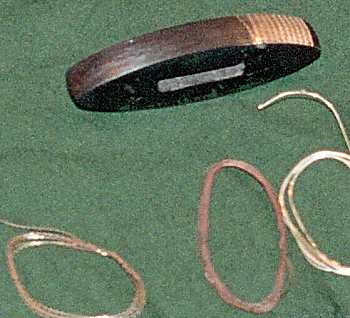The process requires exquisite control on the part of the smith. Fine, evenly spaced channels with a W-profile have to be cut in the iron. Fine wire with uniform twists must be created from precious metals. The wire must be perfectly hammered into place. Some historical pommels have as many as 20 channels per cm (about 50 per inch). The replica crossguard shown to the right is work in progress. Three of the four types of wire being inlaid are also visible. The pitch of the inlay on this replica is on the order of 20/cm, and the wire is 28 gauge (0.32mm diameter). |