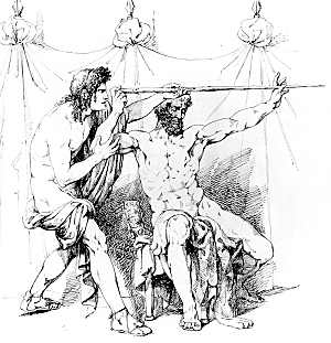 Returning to the company of the gods, Loki found them throwing missiles against Baldr in sport. To one side was Höðr, Baldr's blind brother. Loki asked Höðr why he wasn't joining in the sport. Höðr said he had no dart, nor could he see to shoot it. Loki gave Höðr the mistletoe dart, and guided Höðr's hand to throw the dart at Baldr. |