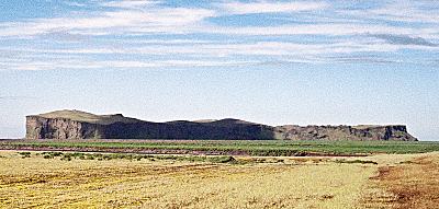 Hjörleifur did not worship or sacrifice to the gods, and he took no such precautions. He landed at Hjörleisfhöfđi (right, as it appears today), built two houses, and began to farm. His slaves revolted and killed Hjörleifur and everyone on the farm. When Ingólfur heard the news and traveled to the site, he commented that it was a sad end for a valiant man, but it's what happens to someone who doesn't worship. Ingólfur tracked down and killed the renegade slaves. |